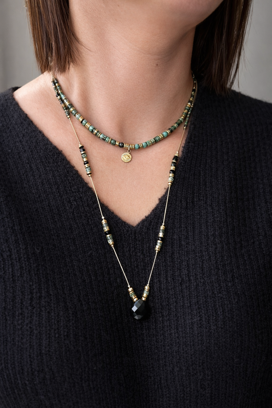 Collier sautoir réglage Turquoise africaine et Agate noire