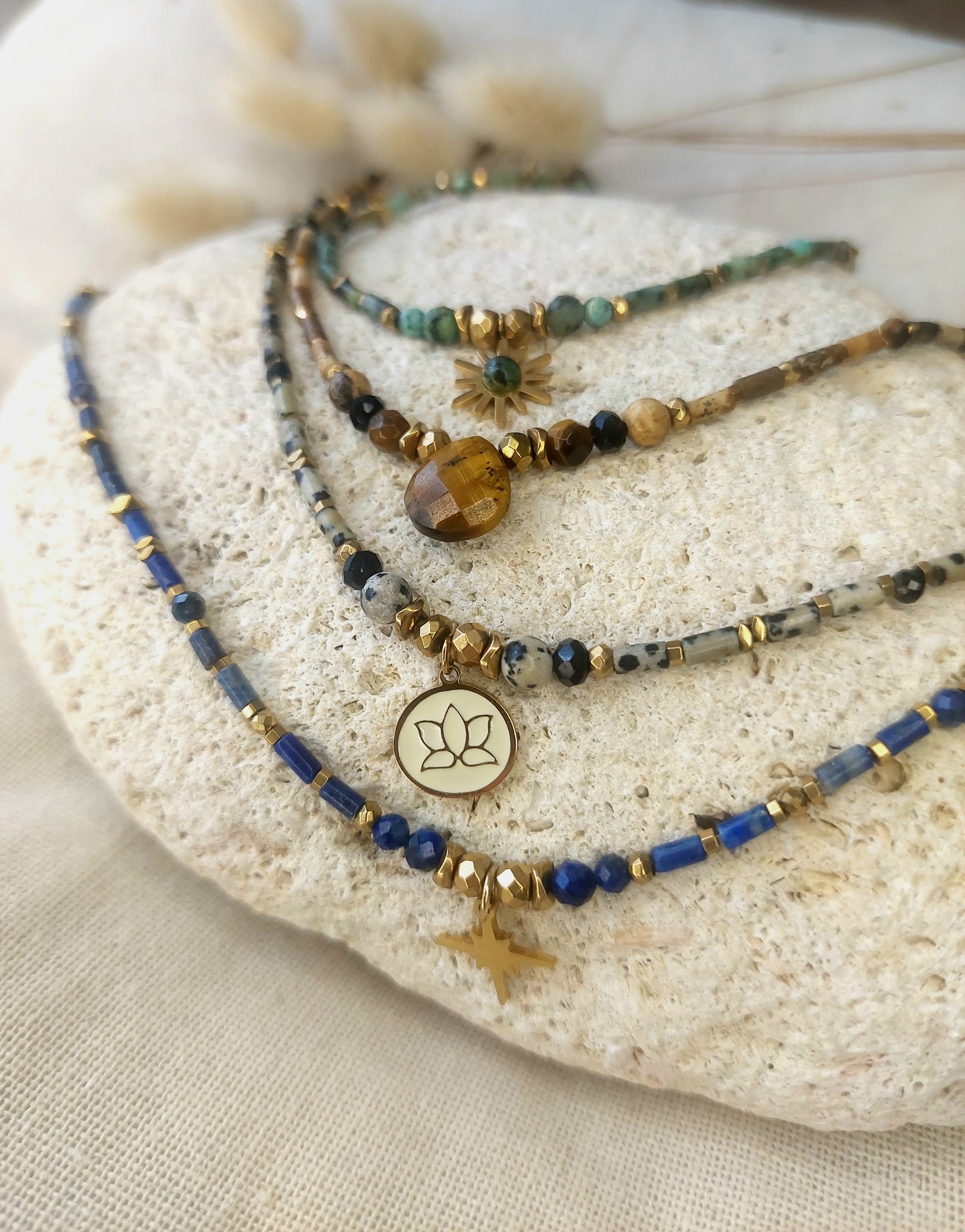 Chaque perle révèle des nuances intenses de bleu outremer, évoquant à la fois calme intérieur et puissance spirituelle. Ce bijou apporte une touche d’élégance naturelle, tout en ayant une forte dimension symbolique, le lapis-lazuli est réputé pour stimuler la clarté mentale, l’intuition et la communication authentique.