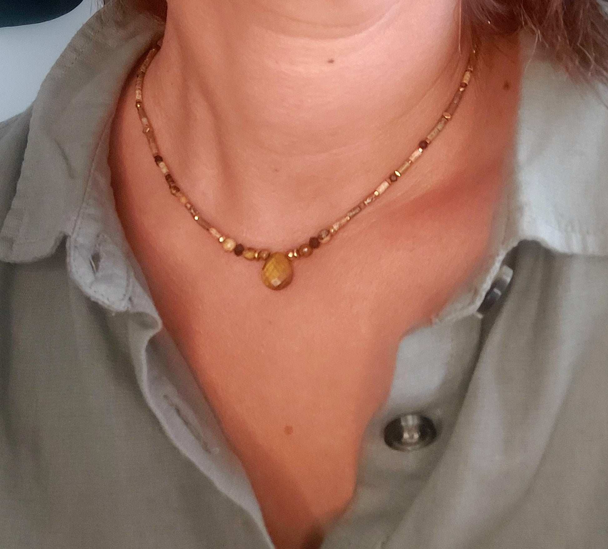Ce collier unique et un mélange de deux pierres naturelles puissantes : le jaspe paysage, aux teintes chaudes et sablonneuses évoquant les vastes étendues désertiques, et l’œil de tigre, connu pour ses reflets dorés et bruns chatoyants. Ensemble, elles forment une pièce empreinte d’élégance naturelle.