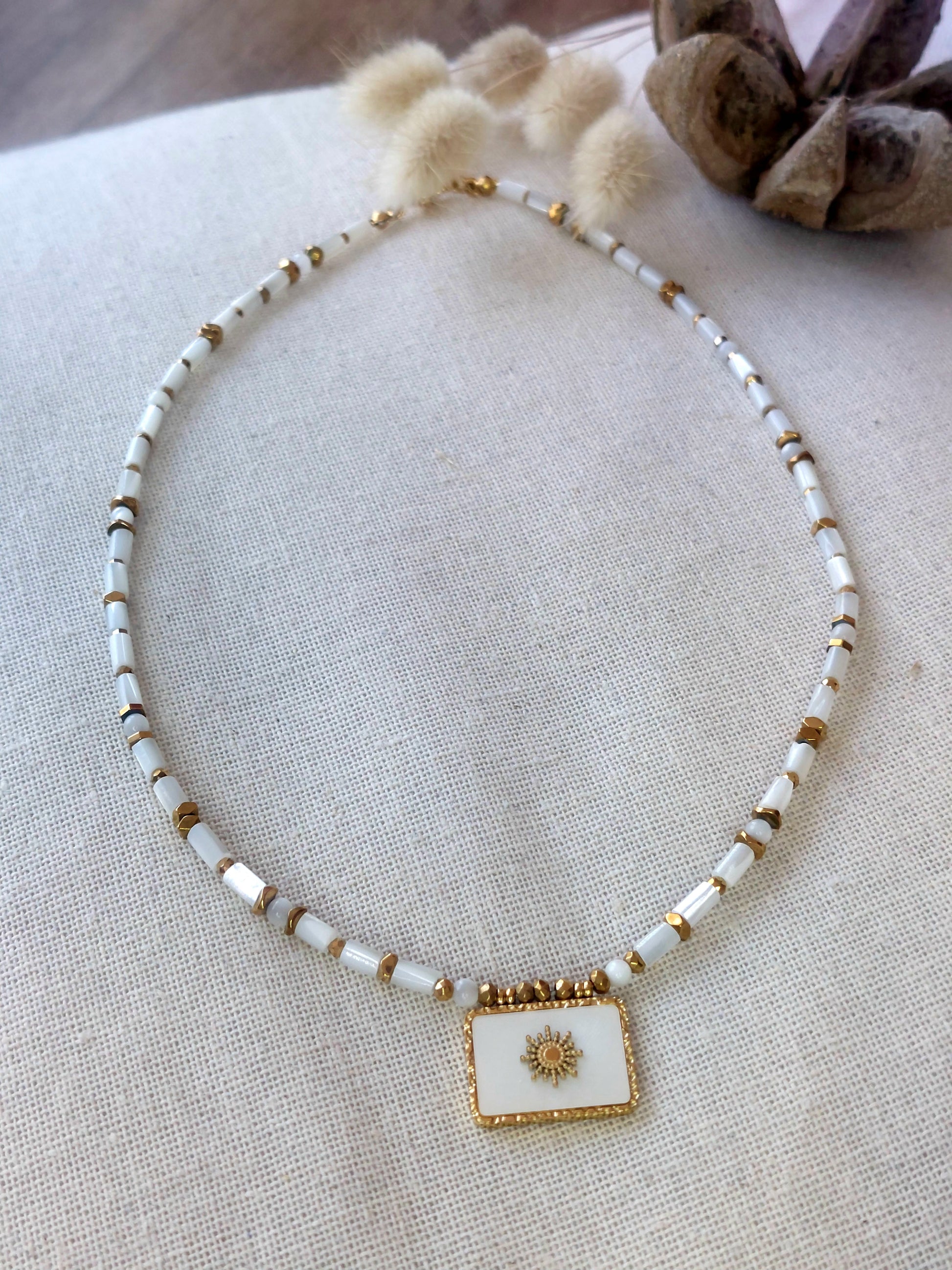 - Pendentif soleil texturé sur nacre naturelle base acier inoxydable 316L hypoallergénique