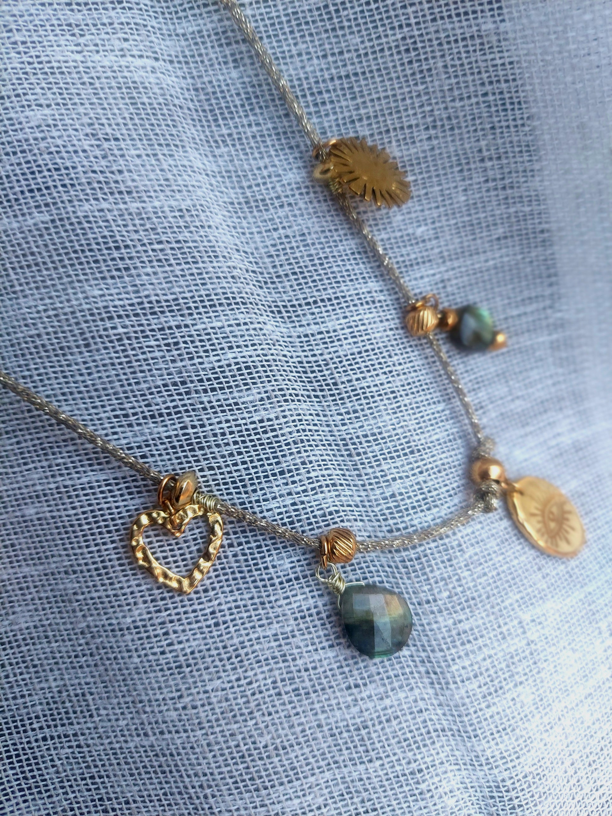 Alliez élégance et énergie avec ce collier bohème unique fait main. Les pendentifs œil, cœur, soleil associés à deux labradorites naturelles (goutte et carrée), illuminent votre style tout en favorisant intuition, créativité et protection contre les énergies négatives.
